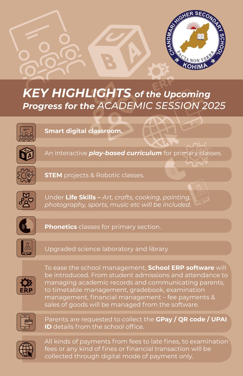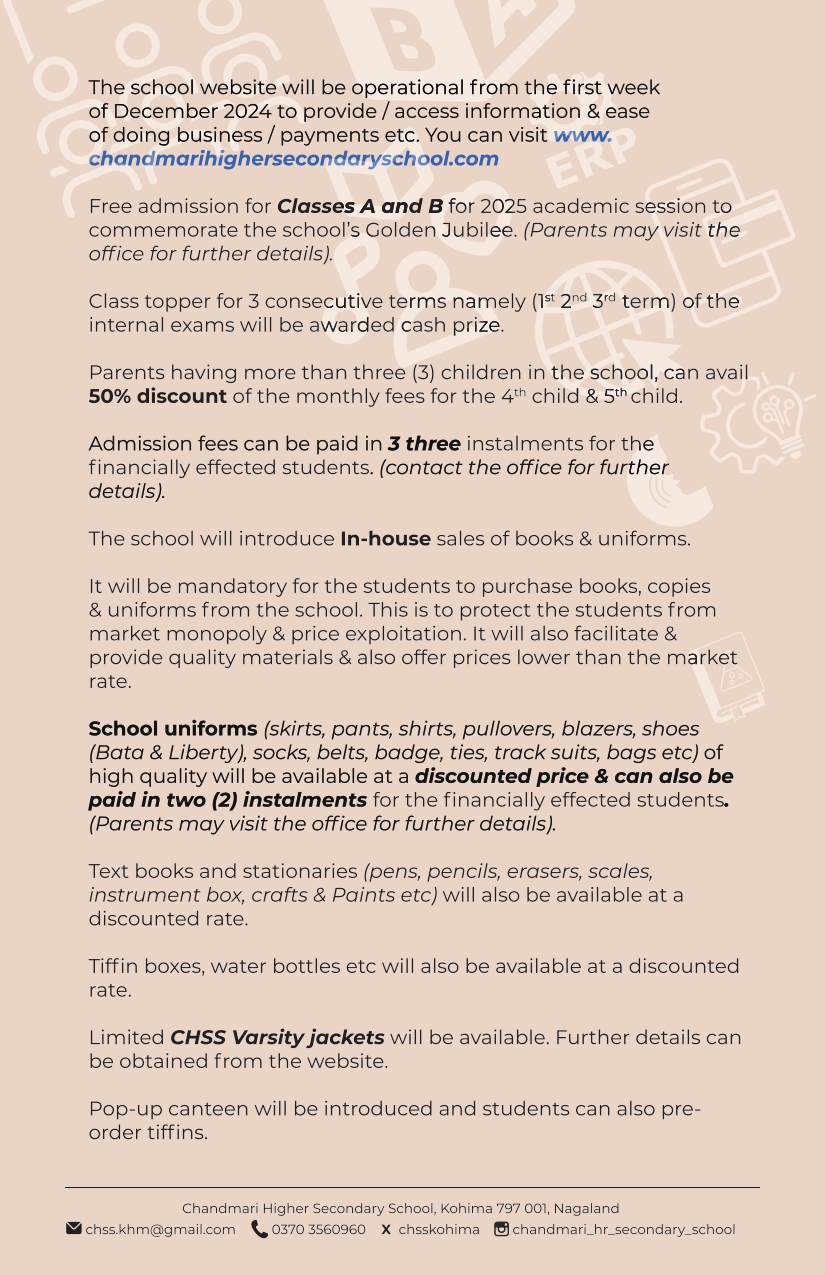 Chandmari Higher Secondary School Kohima (In the beginning – Tiny Tots English School/ Chandmari English School/ Chandmari High School); now re-named to Chandmari Higher Secondary School, was established in the year 1974. The school is situated in Lower PWD Colony below Lotha Church, Kohima. The school since its establishment in the year 1974 has stood the test of time and maintained its illustrious legacy with an impeccable academic and extracurricular record.
